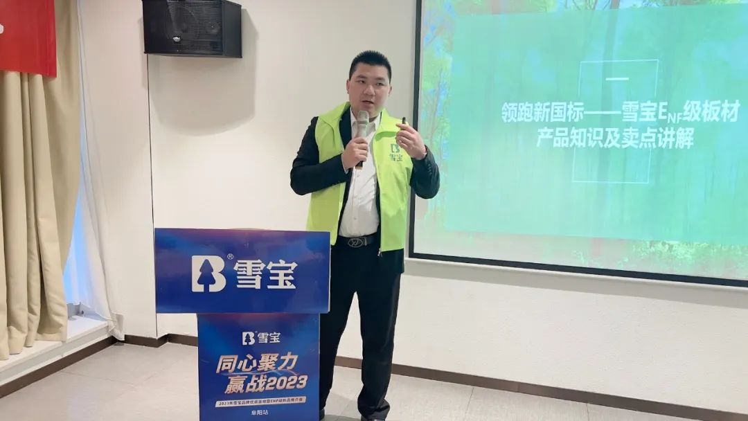 會上,雪寶華北生態(tài)板事業(yè)部區(qū)域負責人曹廣飛先生現(xiàn)場詳細解讀雪寶ENF級板材產(chǎn)品知識及核心賣點。