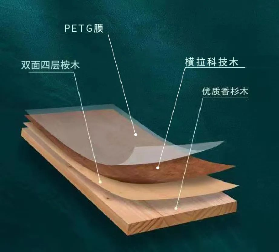 板芯精選規格統一的一級實木香杉方料齒接而成,首先貼第一層桉木養生一周并雙面精度砂光,再貼合第二層桉木再養生一周后,再一次進行雙面等厚精度砂光處理,保證正誤差范圍20絲以內,然后做雙面橫拉科技木皮,確保板材平衡穩定無變形,后貼楊木大皮保證板材表面平整光滑,最后貼雙面同色三聚氰胺紙后做PETG貼合。