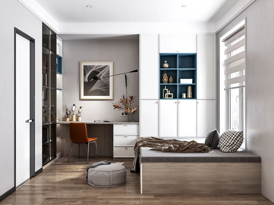 根據需求,可以直接在飄窗做收納柜設計,既能提升臥室的儲物能力,還可以作為小憩休息的好場所。