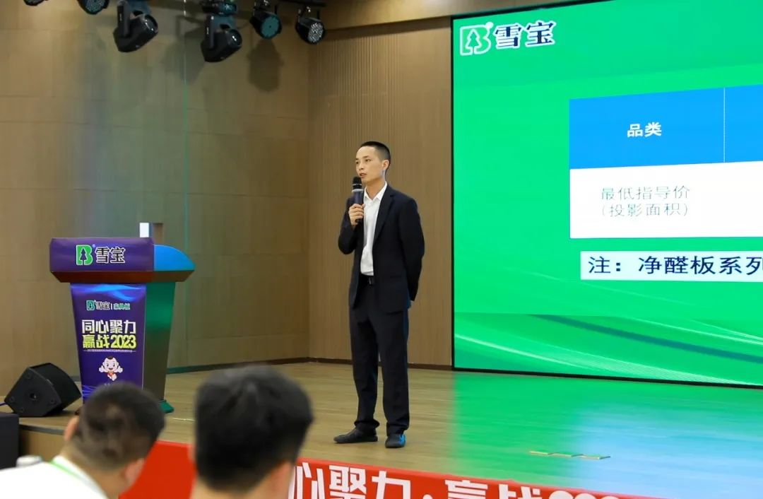 ▲雪寶華南家具板事業(yè)部省區(qū)經(jīng)理吳虎講解《雪寶ENF級(jí)凈味·純芯板》會(huì)上,針對(duì)區(qū)域市場(chǎng)情況以及客戶培訓(xùn)訴求,在品牌力、產(chǎn)品力版塊加大力度,詳細(xì)講述雪寶品牌實(shí)力風(fēng)采,以及雪寶ENF級(jí)實(shí)木多層家具板和ENF級(jí)凈味·純芯板(OSB)產(chǎn)品介紹,深入淺出概述了品牌的獨(dú)特差異化優(yōu)勢(shì)和產(chǎn)品的核心競(jìng)爭(zhēng)力,讓每一位合作伙伴深度知悉品牌和家具板產(chǎn)品的優(yōu)勢(shì)賣點(diǎn),相較終端銷售中的競(jìng)爭(zhēng)品牌和同質(zhì)化的產(chǎn)品,締造了無(wú)懈可擊的雪寶品質(zhì),從而贏戰(zhàn)終端。