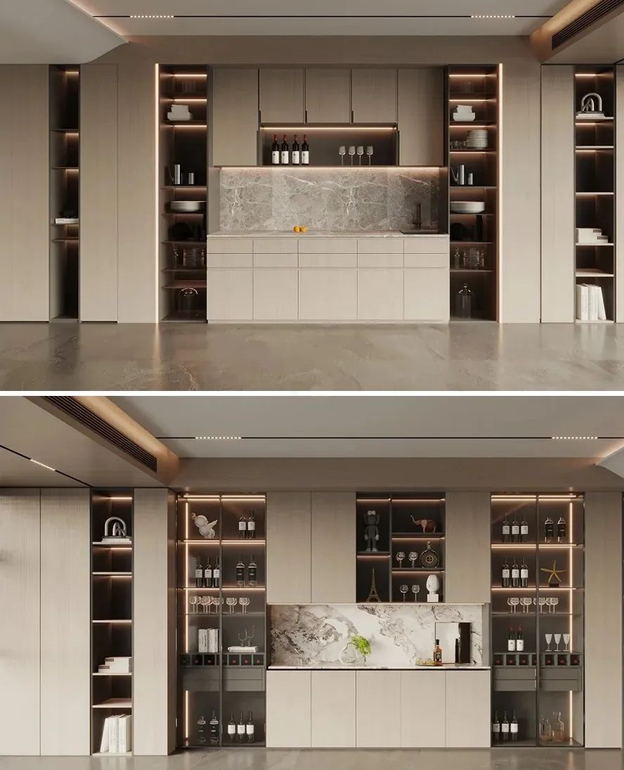 當(dāng)餐廳面積太小,又想要做餐邊柜怎么辦?高顏值的嵌入式餐邊柜就是很好的選擇!嵌入式的餐邊柜可以完美地融入整體設(shè)計(jì),輕松擴(kuò)容,避免占用過(guò)多的空間,同時(shí)視覺(jué)上更為通透和諧,沒(méi)有龐然大物的突兀之感。