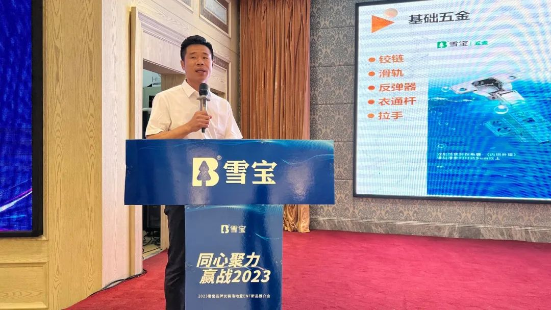 會中,雪寶五金部華北銷售主管譚凱文先生現場講解《雪寶五金》產品知識,從產品研發、使用性能、生產工藝、營銷設計、產品體驗,以及品牌強大售后服務等多維度展開系統專業的介紹,幫助各位合作伙伴再一次的清晰了解雪寶五金的核心差異化優勢。