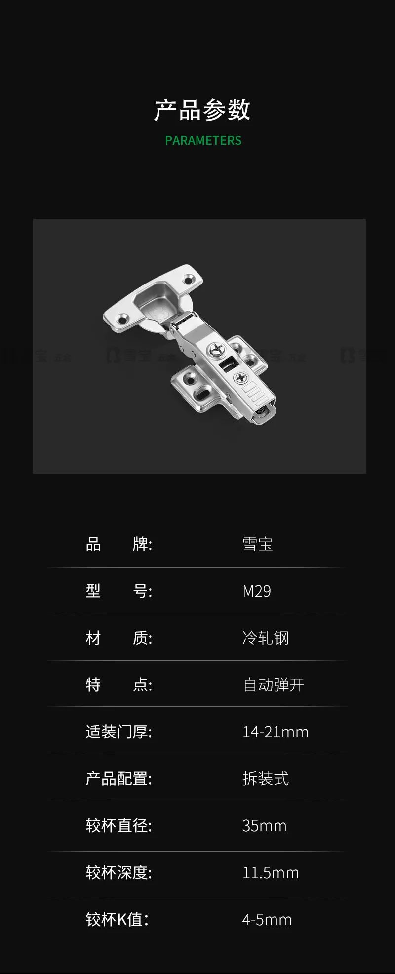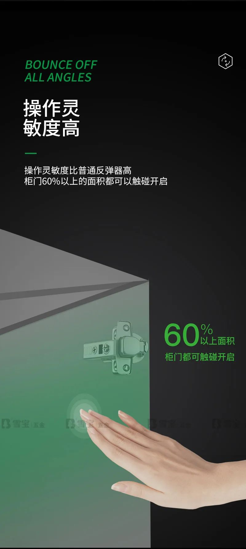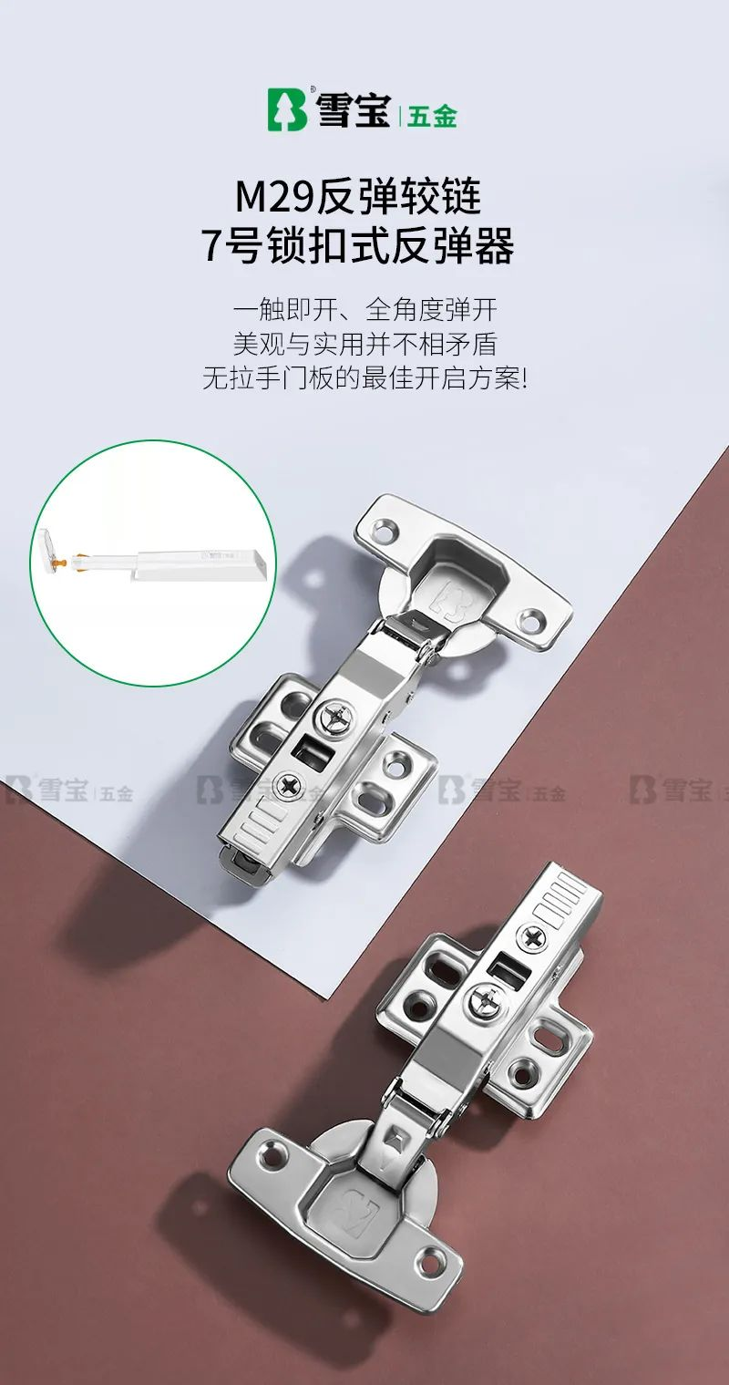 雪寶M29反彈鉸鏈搭配7號鎖扣式反彈器,按壓反彈設(shè)計,輕按開啟,即使雙手沒有空閑,也能輕松開門。免拉手,還原極簡之美,避免碰撞把手,美觀又安全。一觸即開,全角度緩沖彈開,兼具美觀實(shí)用,更是免拉手門板的最佳開啟方案!
