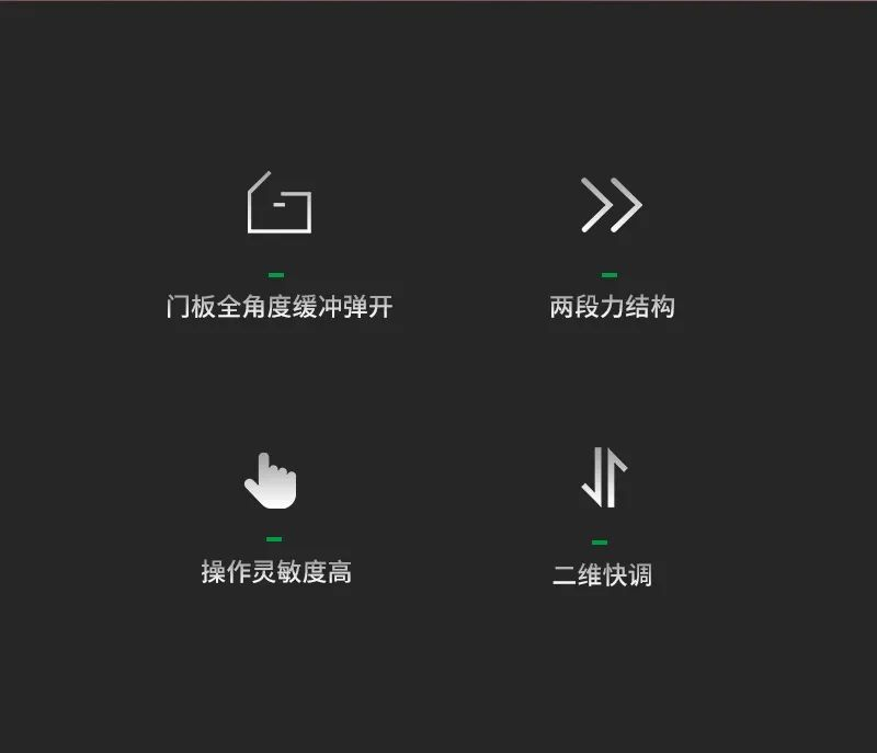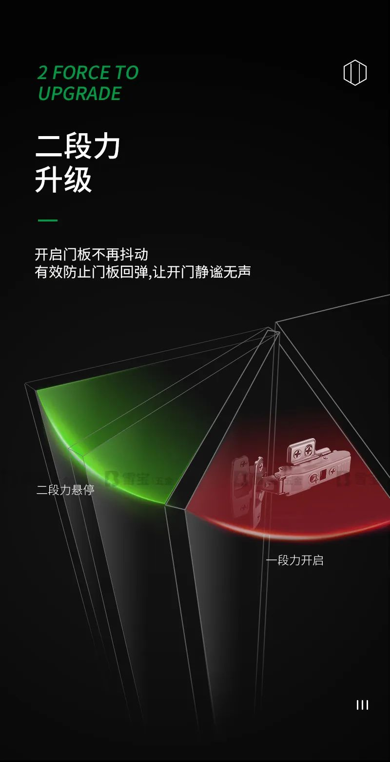 5、5、二段力結(jié)構(gòu),門板開啟不晃動,有效防止門板回彈,開門靜謐無聲;