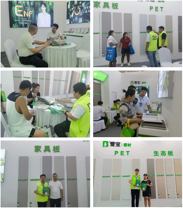 此次展會,前來雪寶板材展區咨詢的客戶絡繹不絕,現場人聲鼎沸,熱鬧非凡。雪寶品牌華北營銷中心的精英們在陳總的帶領下,火力全開,全體人員都展現出信心百倍與無懈可擊的氣勢,全力以赴堅決不錯過每一個客戶,用專業技能服務和解決客戶疑難點。通過精心設計,雪寶展館奪目大氣,成為會場矚目的焦點。雪寶生態板、家具板、配套五金、主流柜門等系列產品悉數亮相,同時雪寶ENF級系列產品也得到眾多客戶的選擇和信賴。