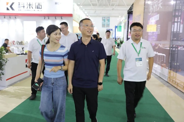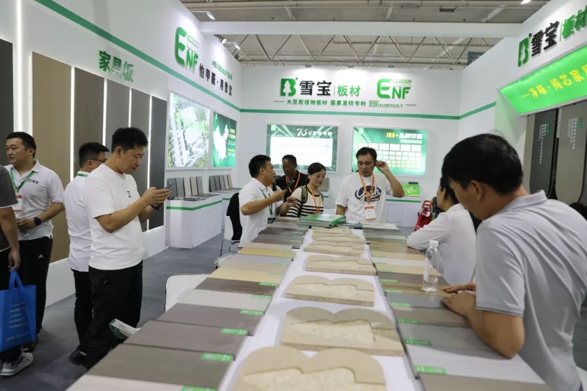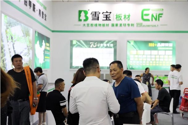 數年前,雪寶板材就已通過研發出遠超國標環保標準數10年的E0級,目前全系產品又率先實現升級ENF級,環保品質一直走在行業前列。同時,通過掌握核心環保技術力量零醛添加的“大豆膠”國家發明專利,讓雪寶板材的產品環保力遠優于市面上多數板材產品!▲集團董事長攜部分高管走進展會現場并與合作伙伴進行溝通