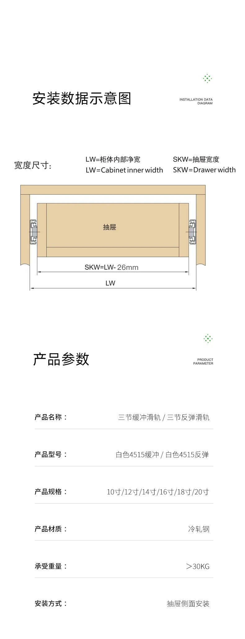 4515緩沖款:緩沖更平穩4515反彈款:輕松按彈開啟無論是緩沖款還是反彈款,都具備下述優勢:1、上海寶鋼原材料,高光封閉電鍍,抗銹能力極強;2、加厚三節鋼珠抽屜滑軌,標準厚度,經久耐用;3、進口高精圓鋼珠,平穩、順暢,開合更靜音;4、三節軌全拉出,抽屜一覽無余,空間最大化;5、承重30kg,平穩堅固;6、防撞膠墊,降噪消音;