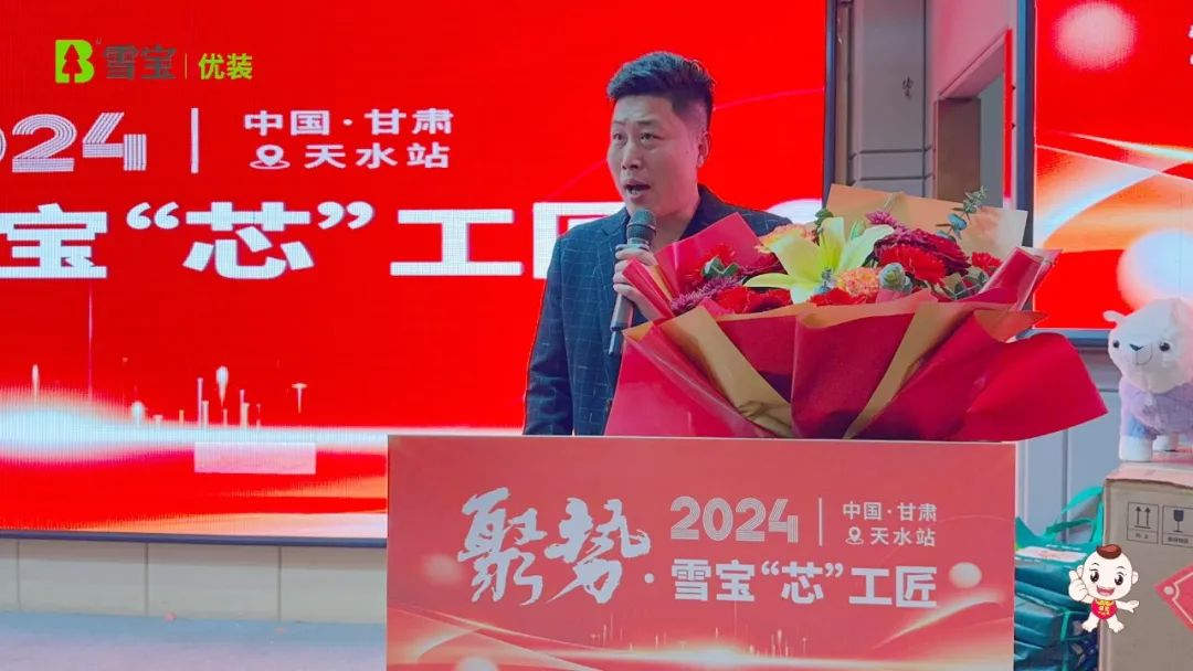 會上,雪寶品牌華北區甘肅天水運營中心負責人吳總現場致詞,表示:“在生存憂患面前,雪寶品牌緊跟潮流,順時應變,在創新中引領,抓住發展機遇,全新盈利模式“雪寶優裝定制”體系成熟完善,市場銷量業績逐年攀升,與廣大合作伙伴的關系更為親密無間,大家互利共贏。在共同努力下,我很有信心在2024年實現業績再上一層樓,讓我們同心聚力,不斷超越,創造更輝煌的明天!”