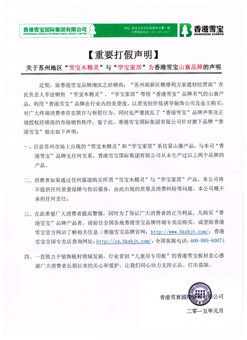 近期,原雪寶品牌淘汰之經(jīng)銷商:“蘇州高新區(qū)橫塘利萬(wàn)家建材經(jīng)營(yíng)部”吉氏負(fù)責(zé)人非法銷售 “雪寶木精靈”、“學(xué)寶家居”等傍“雪寶”品牌名氣的山寨產(chǎn)品,利用“雪寶”品牌在行業(yè)內(nèi)的美譽(yù)度,以質(zhì)劣但價(jià)低誘導(dǎo)裝飾公司及業(yè)主購(gòu)買,對(duì)廣大終端消費(fèi)者存在欺詐與售假行為,同時(shí)也嚴(yán)重?cái)_亂了“雪寶”品牌聲譽(yù)及正規(guī)授權(quán)經(jīng)銷商的市場(chǎng)銷售秩序,鑒于此,雪寶集團(tuán)有限公司針對(duì)旗下品牌“雪寶”做出如下聲明: