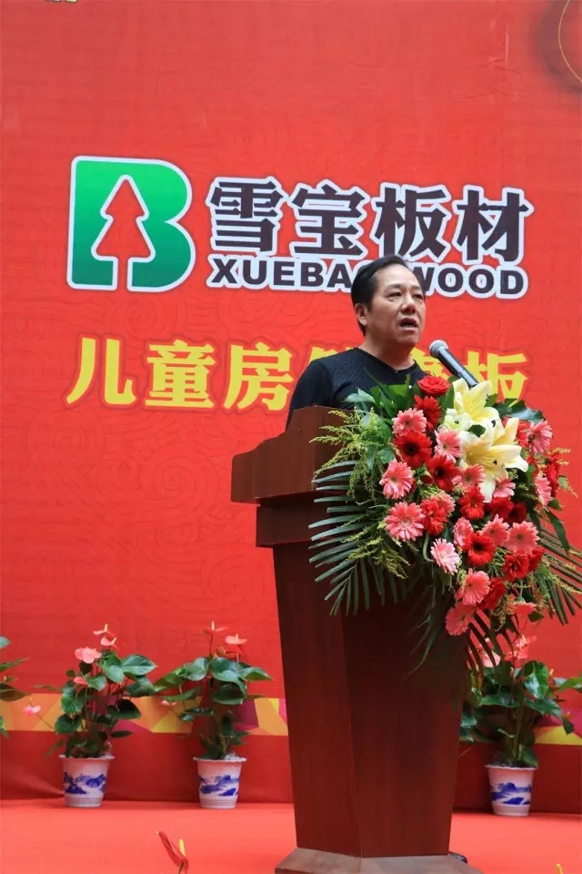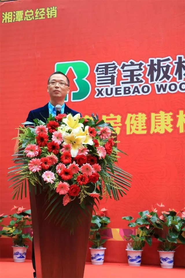 ▲雪寶板材國內營銷中心總經理李振先生為開業典禮致辭