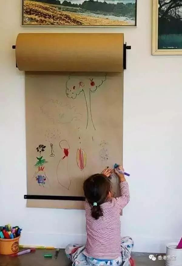 ▲如果擔心黑板灰會造成粉塵過敏,那么在墻上裝訂一卷畫紙吧,讓孩子時時刻刻都可以來一場頭腦風暴!