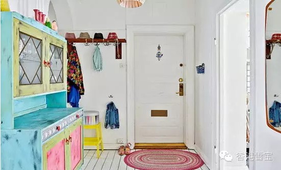 入戶門選用的是和墻壁白色一致的色調,顯得整體劃一,十分干凈,亮黃色的椅子讓空間層次豐富起來,對面的藍綠色儲物柜的藍色、粉色形成了很好的碰撞關系。