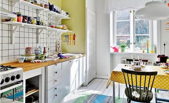 廚房,雖然顏色運用的很多,但完全不會覺得混亂,這是極其難得的一點,整個空間采光效果本身就不錯,加上選用的顏色以亮麗的色彩為主,更加顯得耀眼。