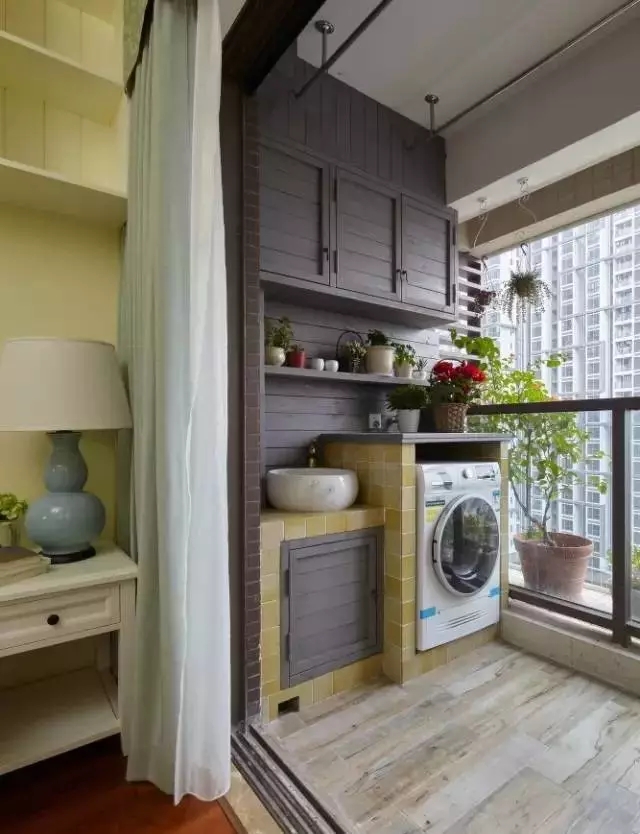 在這個不大的區(qū)域內(nèi),陽臺被利用為洗手池和洗衣房,也是無形中拓展了使用功能,吊柜也發(fā)揮了擴(kuò)展使用空間的功能。