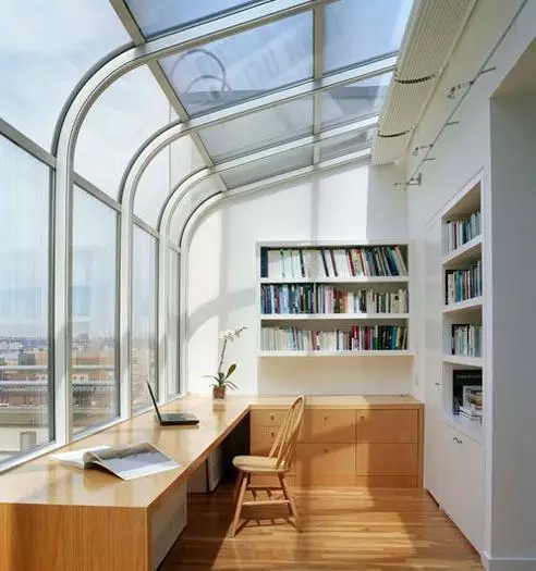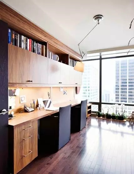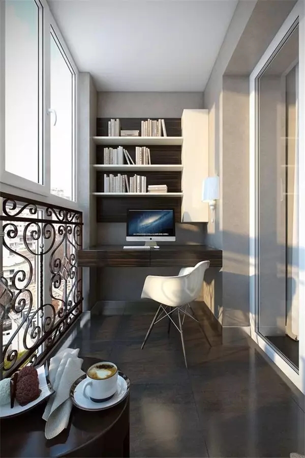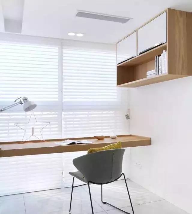 陽臺改造成書房已經(jīng)成為當(dāng)下的流行風(fēng)格,一個定制的書桌柜讓陽臺變出了一個小書房,吊柜還為收納擴(kuò)容了。