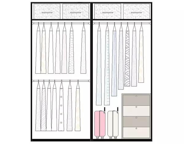 A:在國外一種比較通用的結構是上下只有兩層,上層放過季衣物或被褥等低頻使用的物品,中間一整條掛桿,下面完全留白,根據實際需求用收納工具進行空間填充。