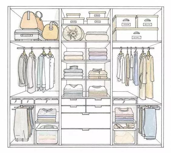 同時對目前的衣服數量與類別有清晰的了解,能夠確定衣柜的大。粚σ路M行分類,并為其安排合適的收納方式(平疊、豎疊、懸掛);根據衣服的比例分配掛桿、隔板、抽屜的位置與數量,并為后期的變動留出可以調整的空間。