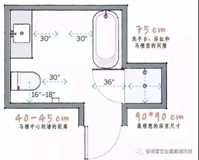 注:馬桶中心到墻的距離是40~45cm,最理想的浴室尺寸是90cm*90cm,洗手臺、浴缸和馬桶前的間隙是75cm。